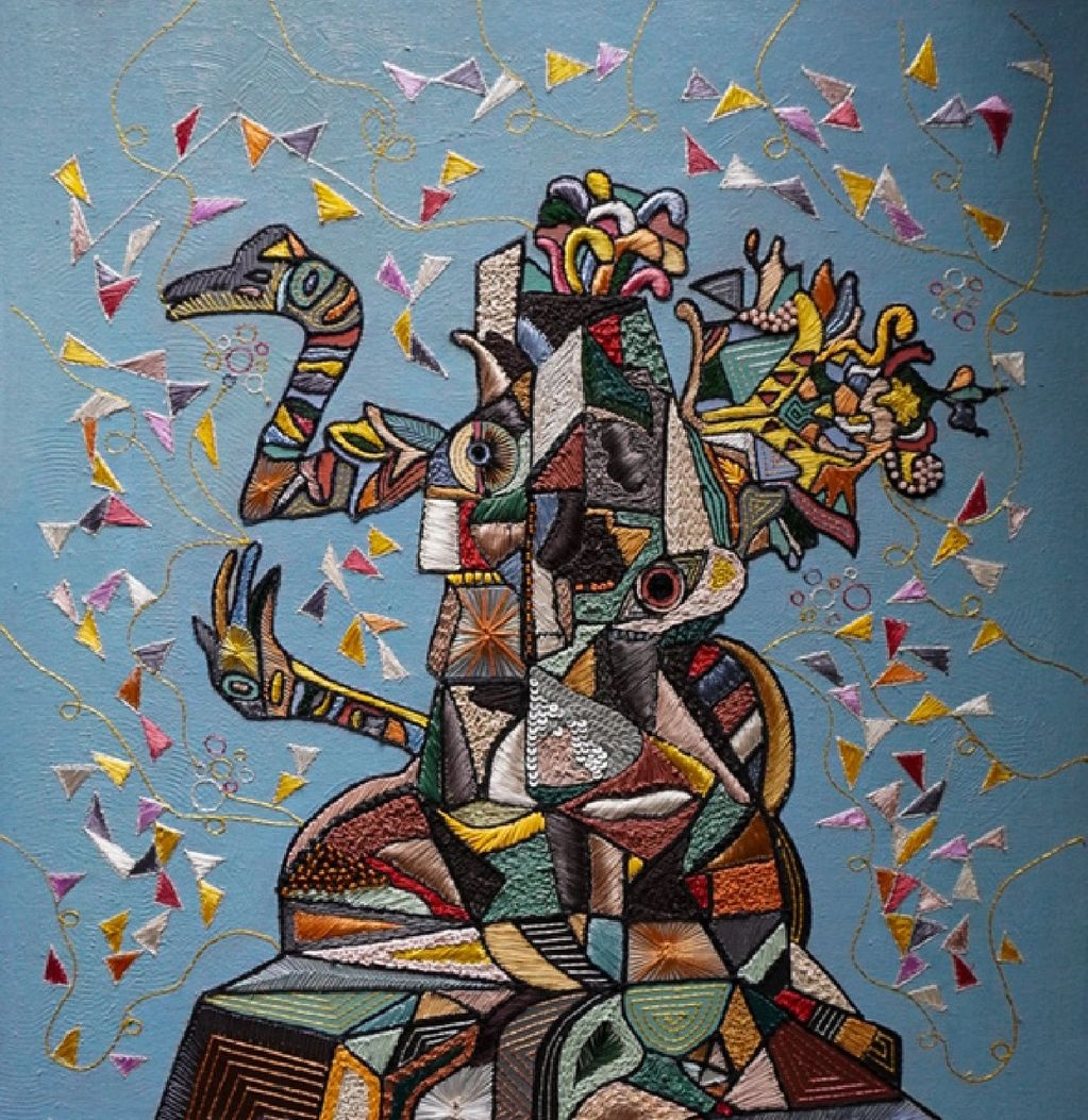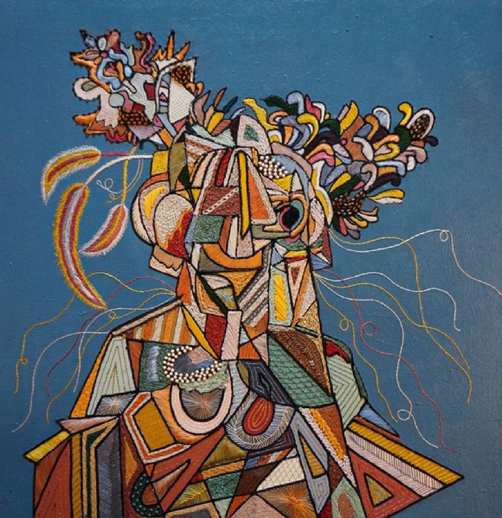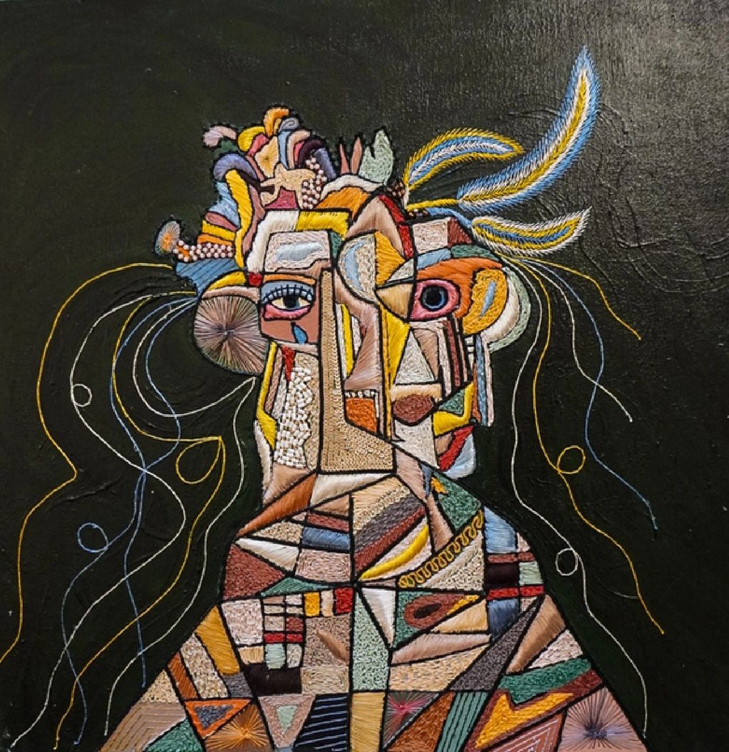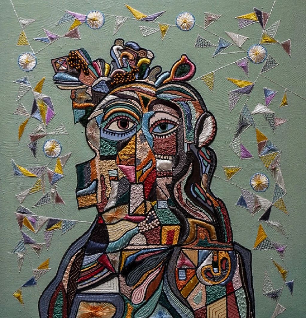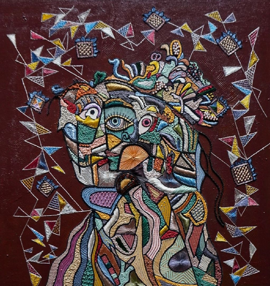Medium - Oil, Acrylic Paint, Textile Embroidery, Use of Yarns and Up-Cycled Leather, Beads and Sequins