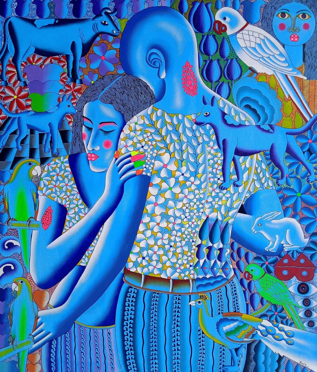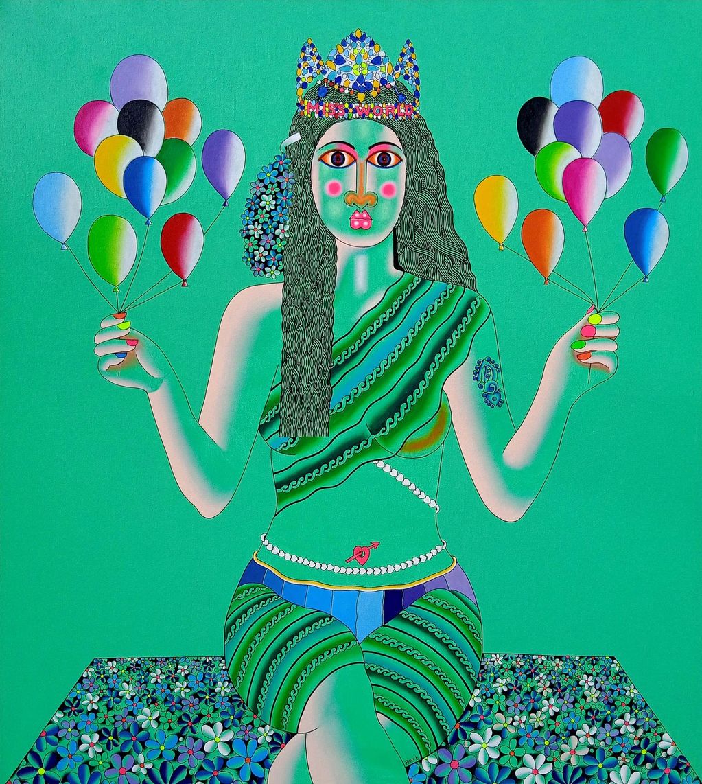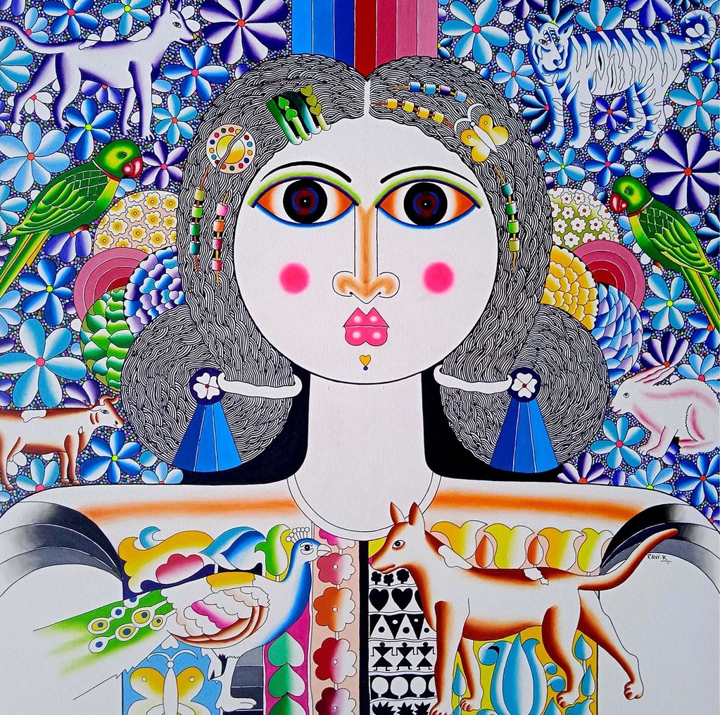 Kattakuri's paintings are silent dreams that beckon the spectator and capture the spirit of urban and rural India in all its glory. He draws inspiration from city belles, paddy fields, and common farm animals like goats, dogs, and cows. The most prominent figure in his paintings is the female form, usually used to highlight virtuous and gentle attributes.