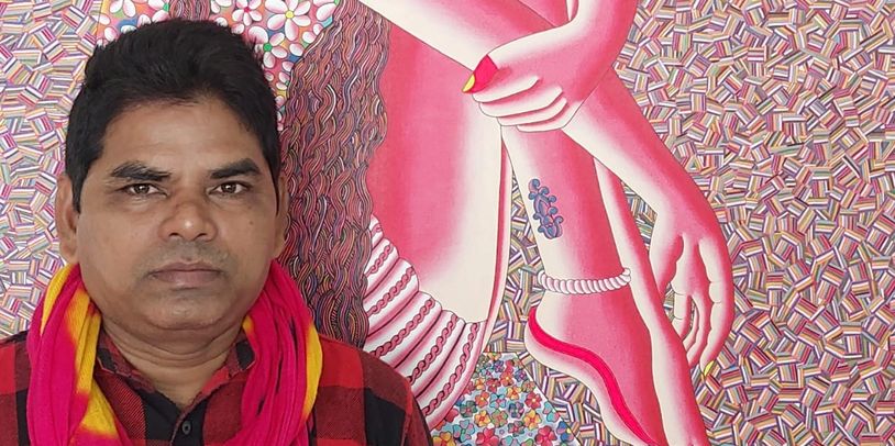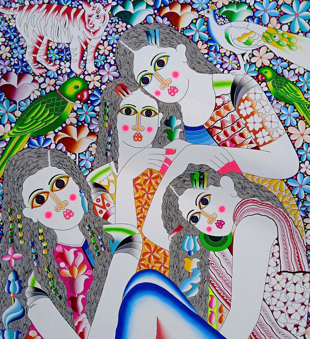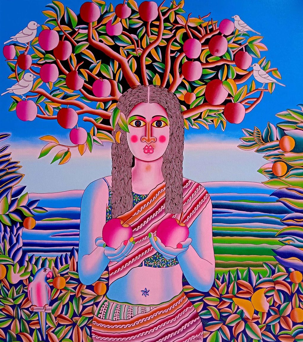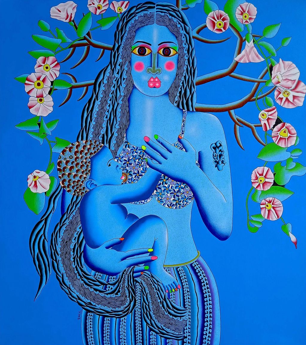 Kattakuri's paintings are silent dreams that beckon the spectator and capture the spirit of urban and rural India in all its glory. He draws inspiration from city belles, paddy fields, and common farm animals like goats, dogs, and cows. The most prominent figure in his paintings is the female form, usually used to highlight virtuous and gentle attributes.